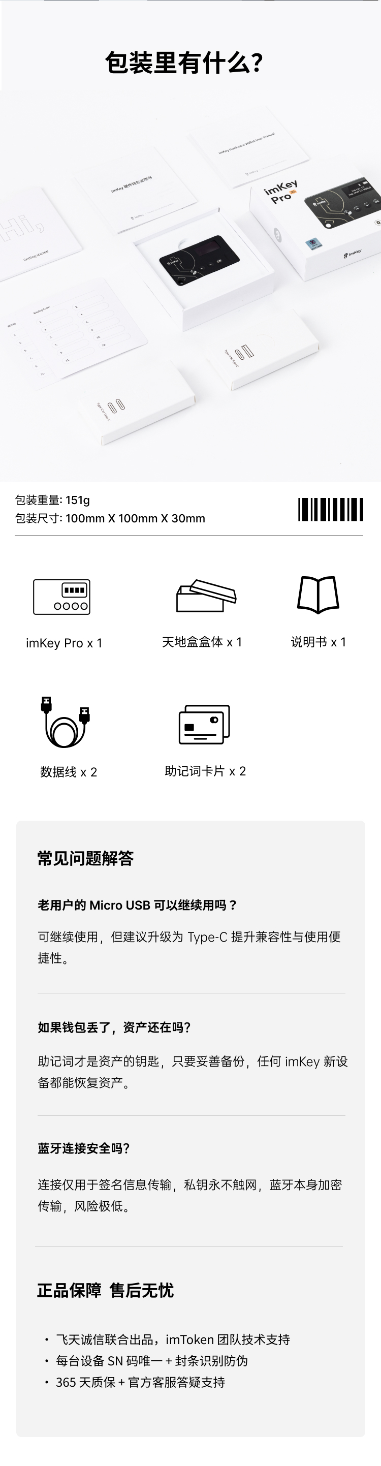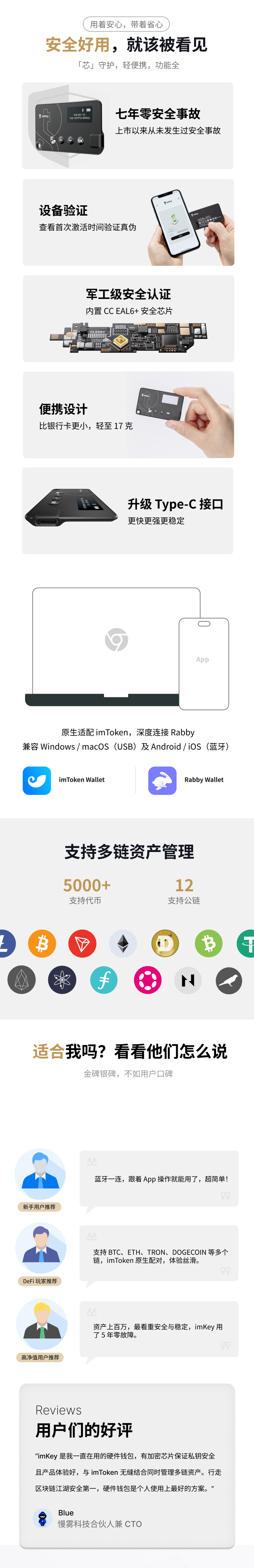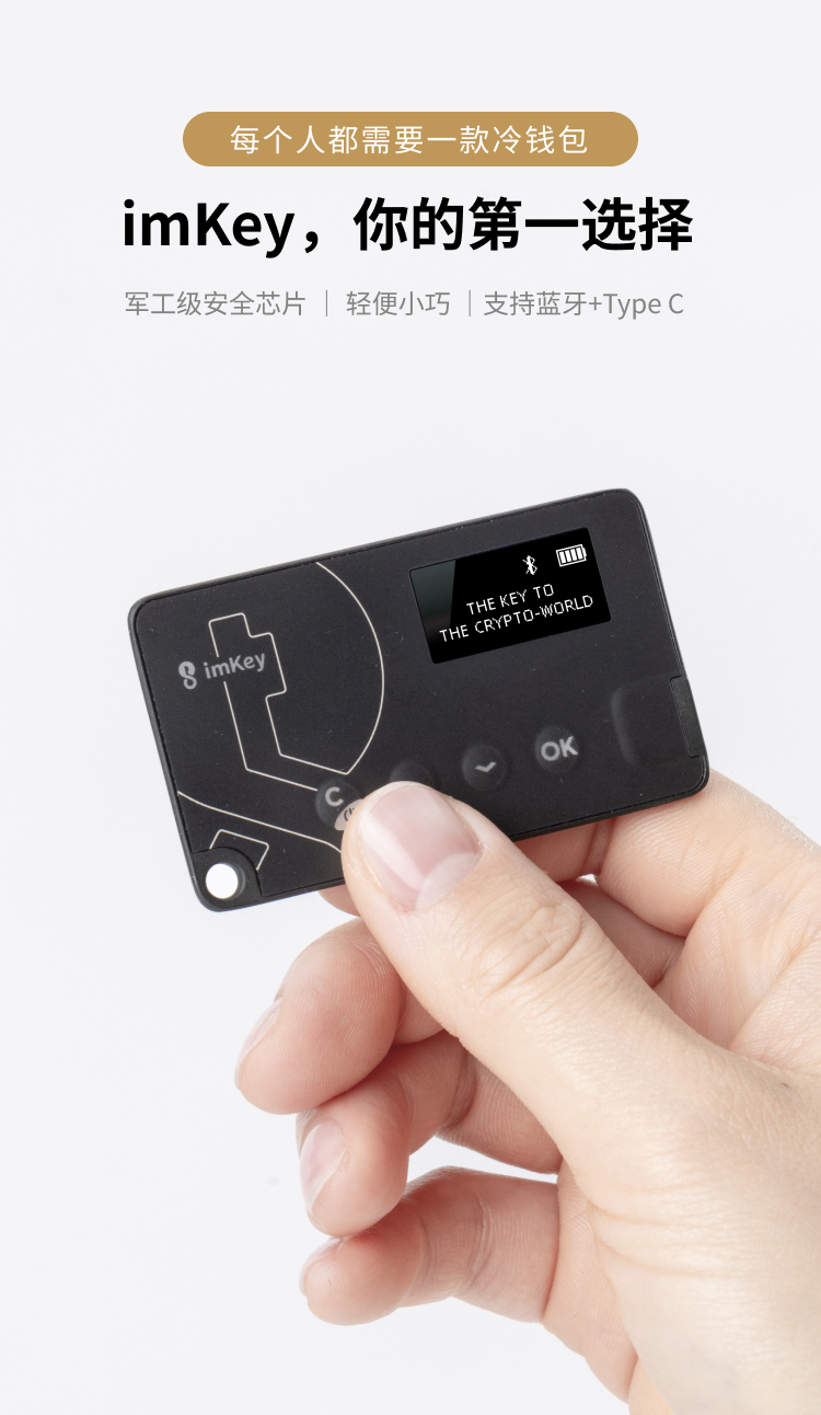 比较了好几个品牌,最终还是选择imkey,我比较看重真随机数生成和安全芯片的防护,另外imtoken钱包一直值得信赖。东西到手很小巧玲珑,完全可以像卡片一样放入钱包,按键很灵敏输入密码操作很顺畅,体验感拉满,对比其他的硬件钱包可以用丝滑来形容。购入前查看了芯片的报告,确实如店铺所述达到了军工级的安全标准,物流速度顺丰也很快,一次非常愉快满意的购物。